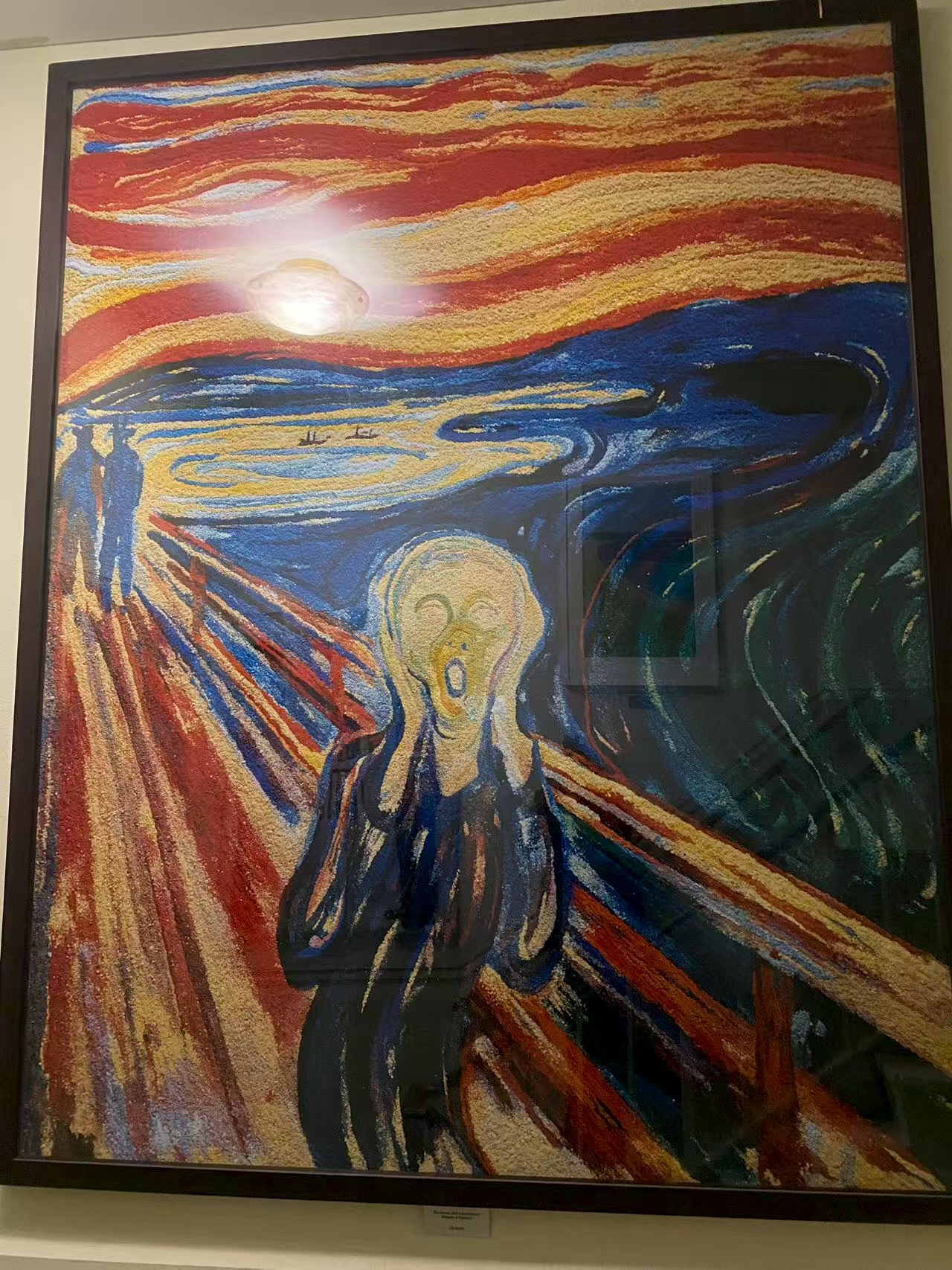 晚上回酒店把昨天没看完的画看了。其中有一对夫妇叫 Christo and Jeanne_Claude的,以包装艺术著称。学艺术的女儿说,其最著名的作品《环绕群岛》,是用粉红色聚丙烯织物包装了迈阿密的11个岛屿。从远处看,像粉红色的云彩。